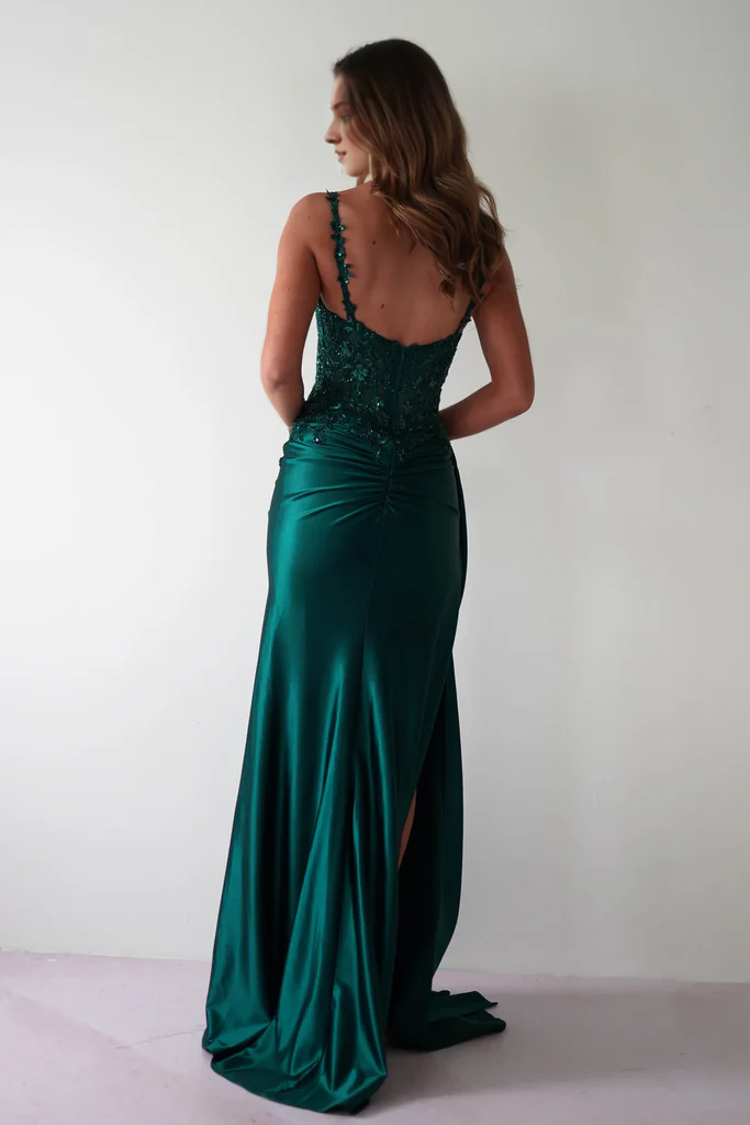 A-line V-neckline sleeveless tight fitting corset with sheer side slits and floor length gowns evening dresses