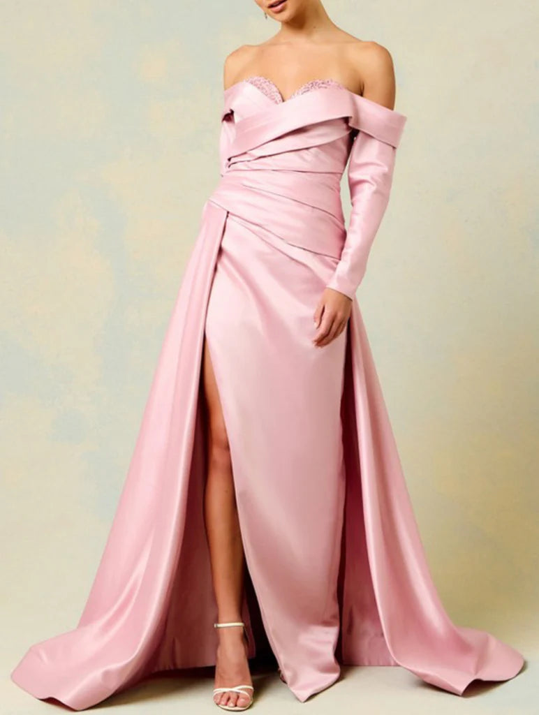 Off shoulder satin side slits and floor length godons evening dresses