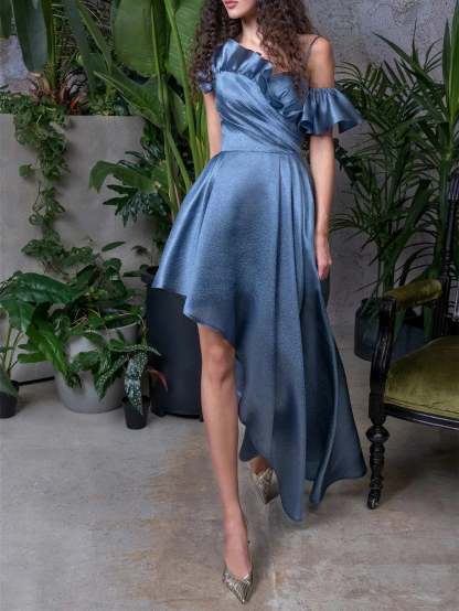 A-line/Princess Off Shoulder Short Sleeves Knee Asymmetric Cocktail Dress