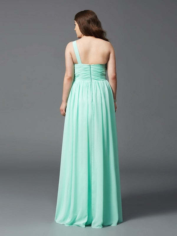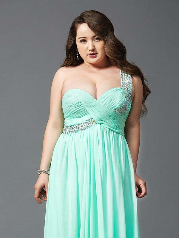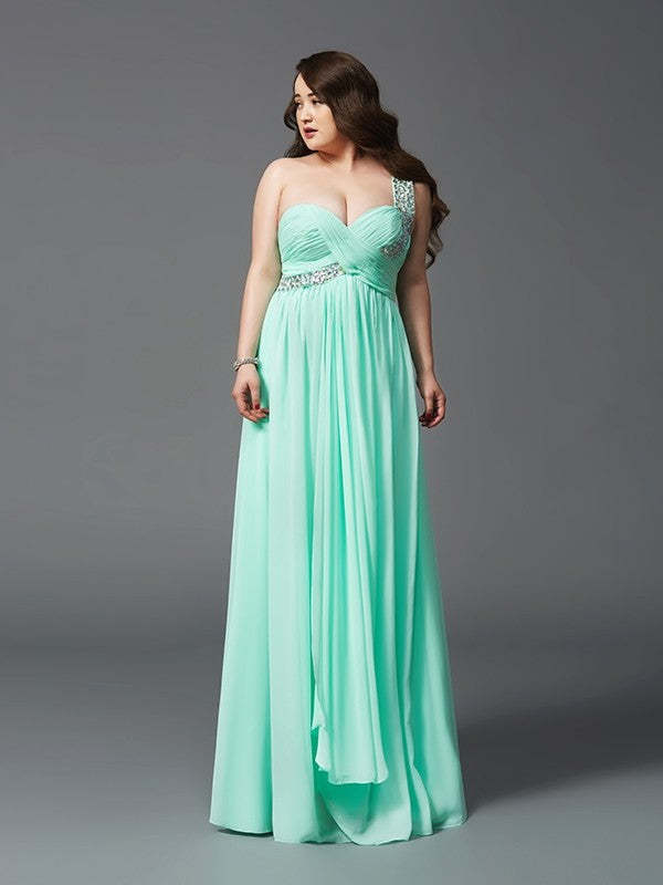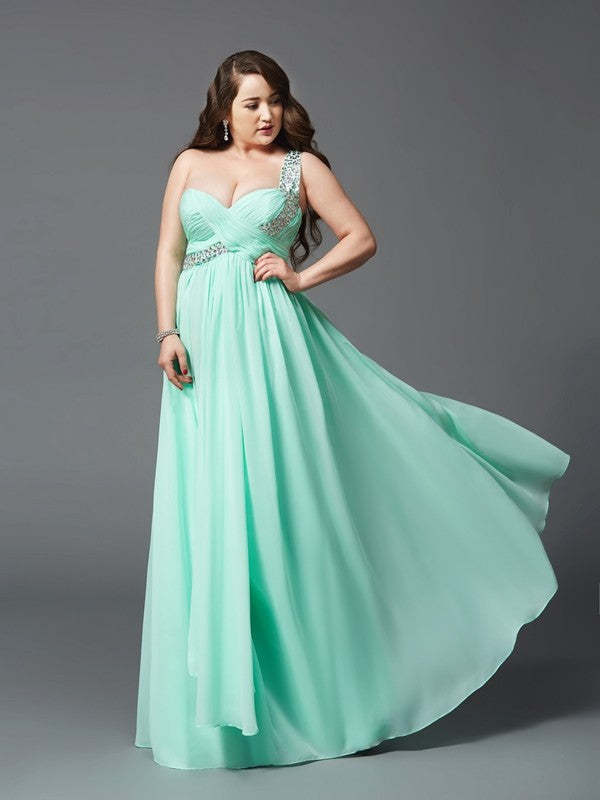 A-Line/Princess One-Shoulder Rhinestone Sleeveless Long Chiffon Plus Size Dresses