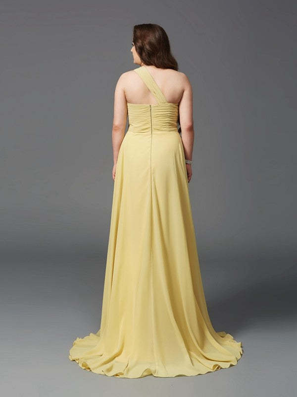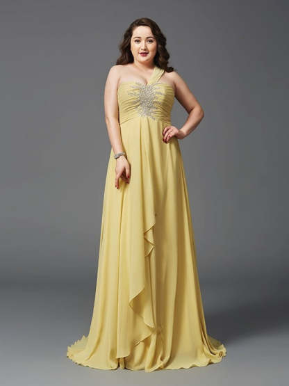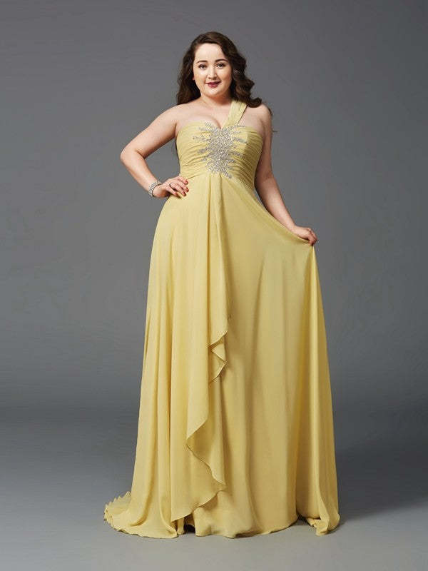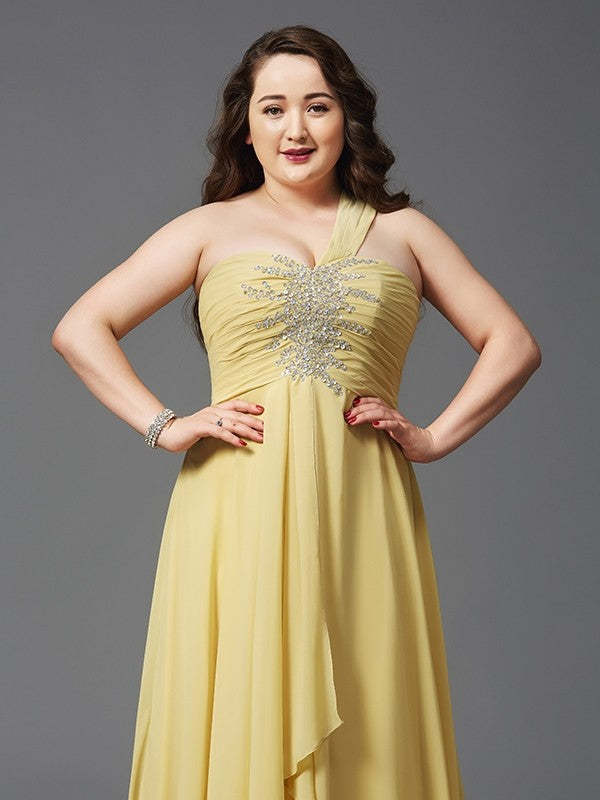 A-Line/Princess One-Shoulder Rhinestone Sleeveless Long Chiffon Plus Size Dresses