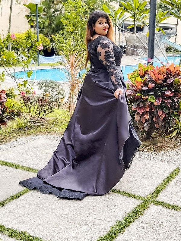 A-Line/Princess Satin Lace Bateau Long Sleeves Asymmetrical Plus Size Dresses