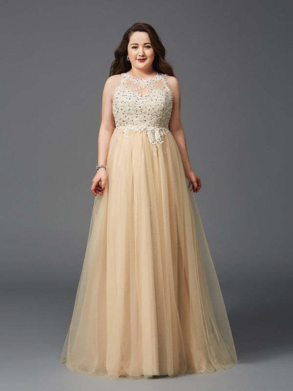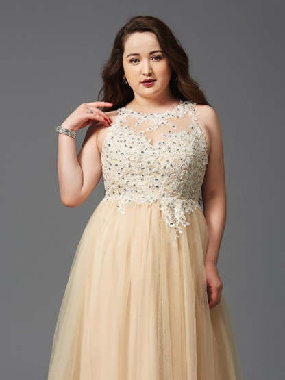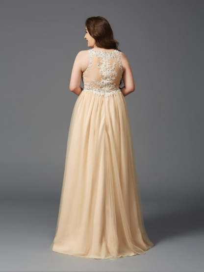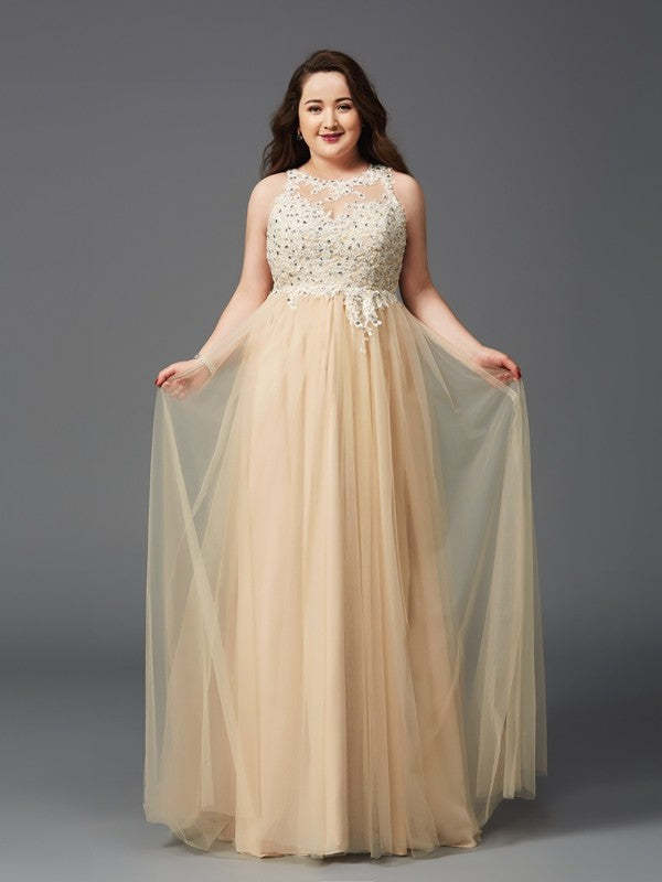 A-Line/Princess Scoop Rhinestone Sleeveless Long Net Plus Size Dresses