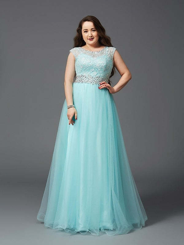 A-Line/Princess Scoop Rhinestone Sleeveless Long Tulle Plus Size Dresses