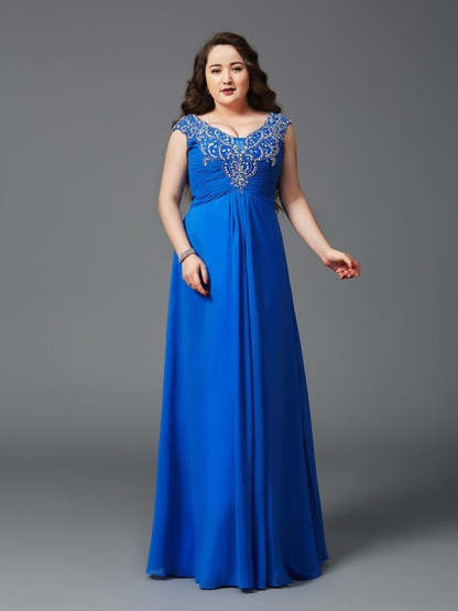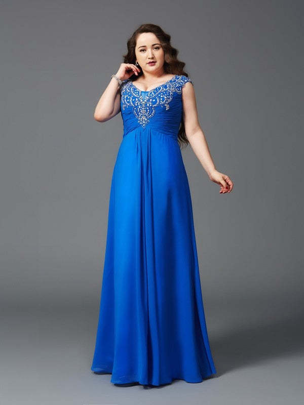 A-Line/Princess Straps Beading Short Sleeves Long Chiffon Plus Size Dresses