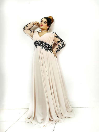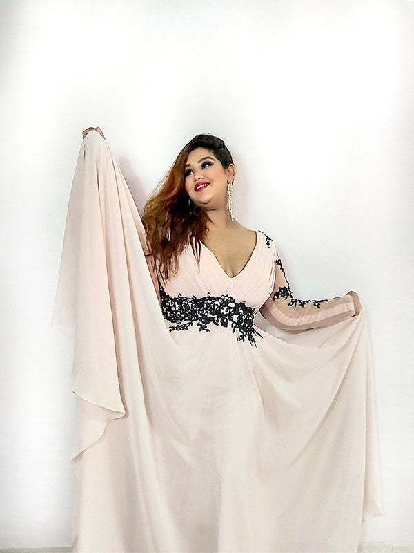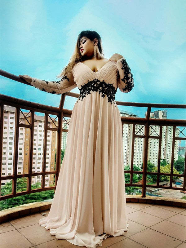 A-Line/Princess V-neck Applique Floor-Length Chiffon Long Sleeves Plus Size Dresses