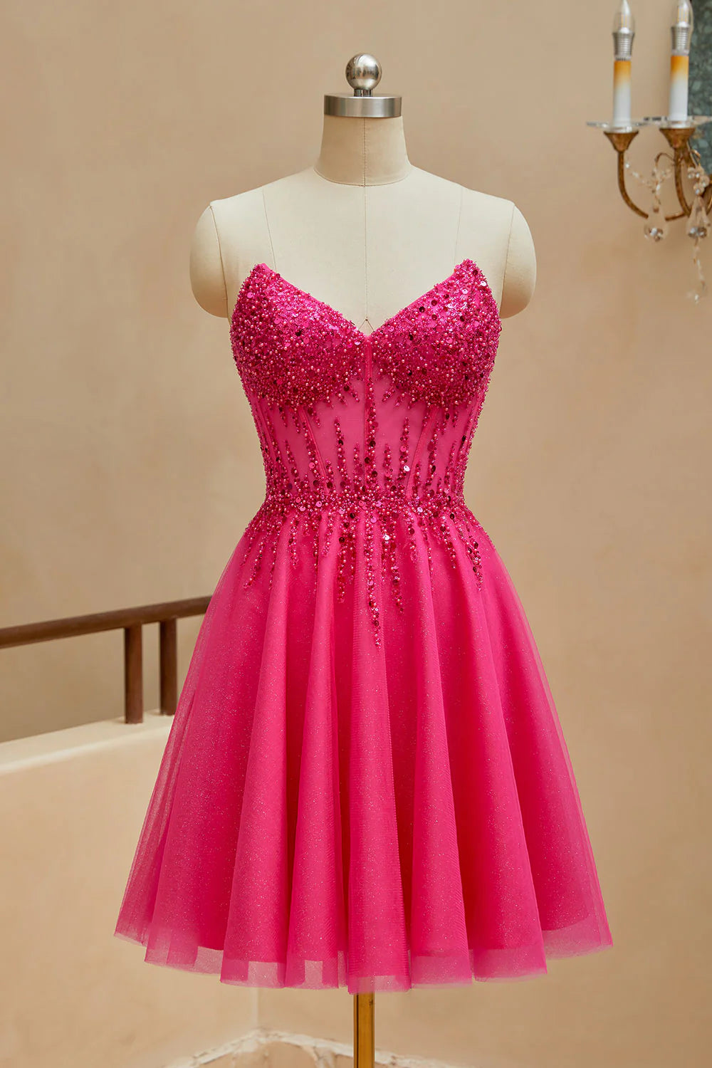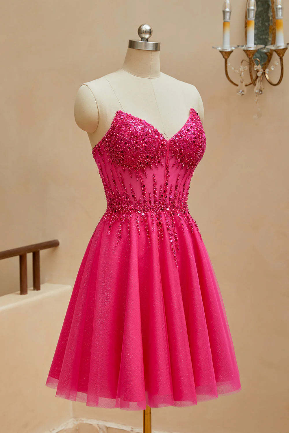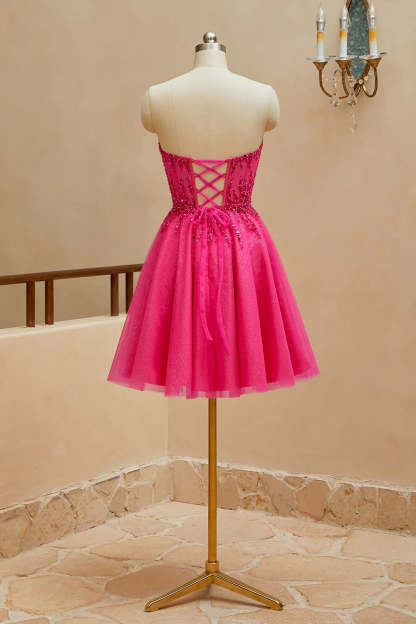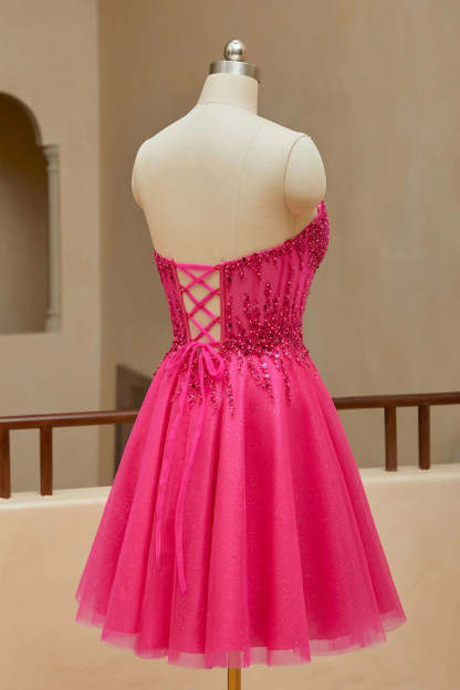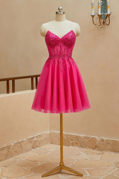 A-line sheer V-neck beaded strapless short mini back to school dress