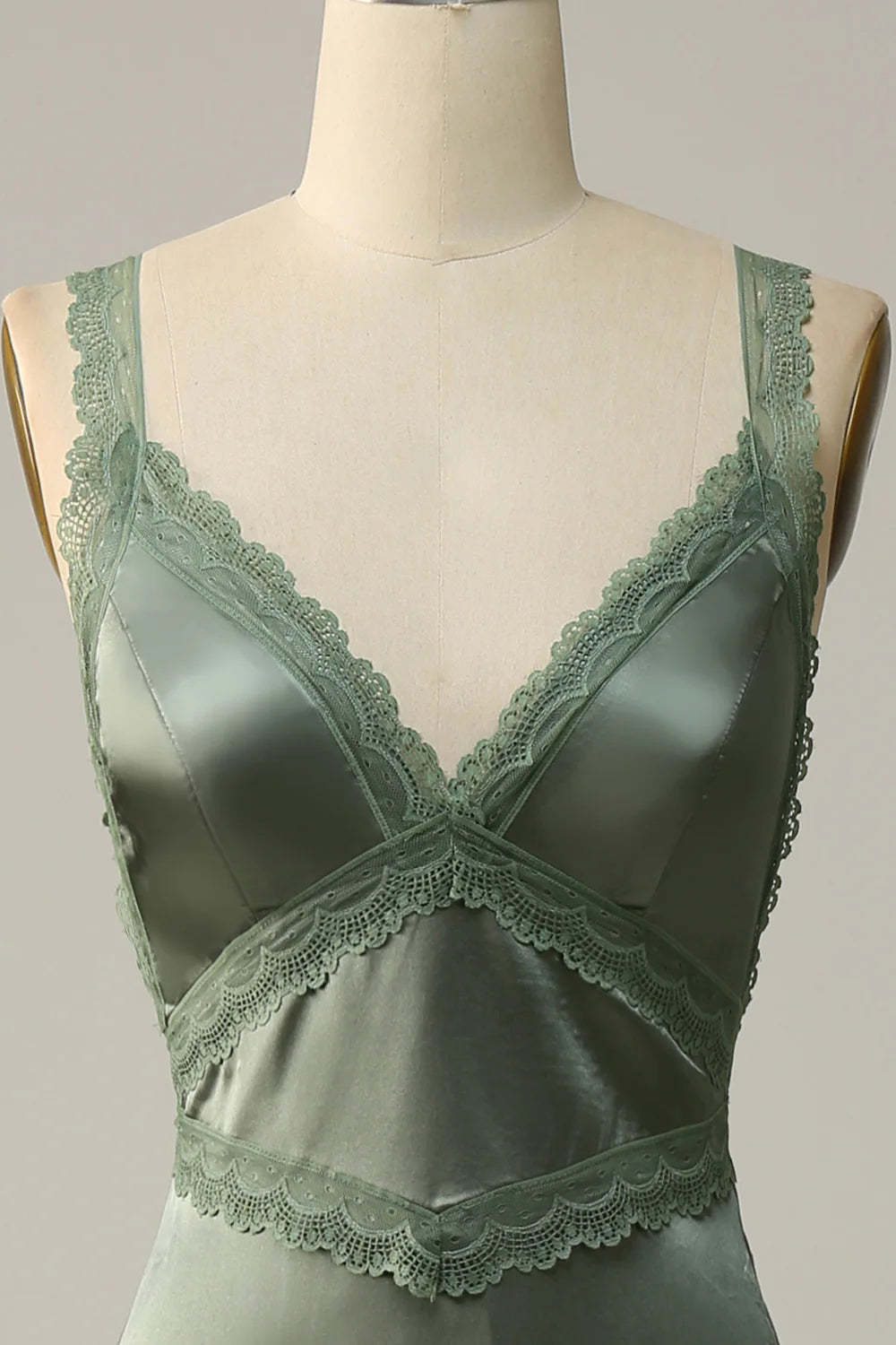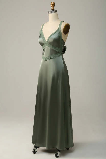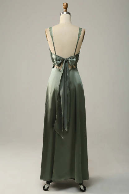 Grey green tight thin shoulder strap back tied satin bridesmaid dress