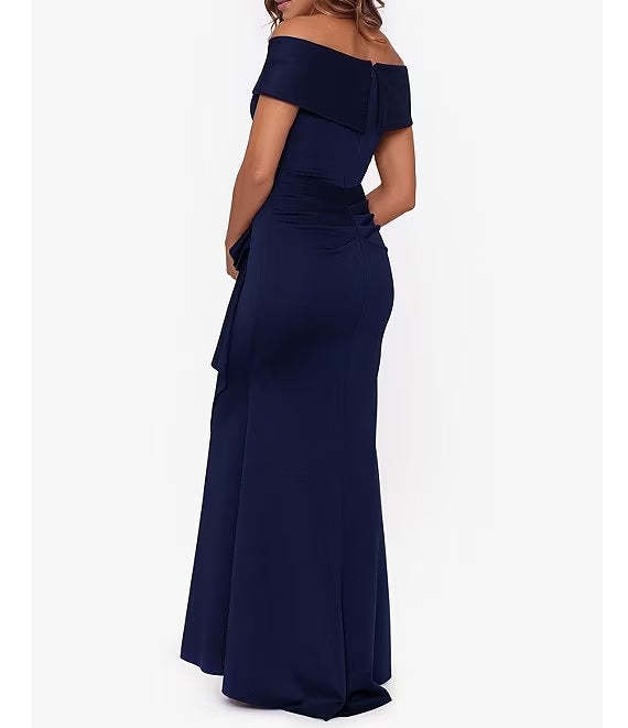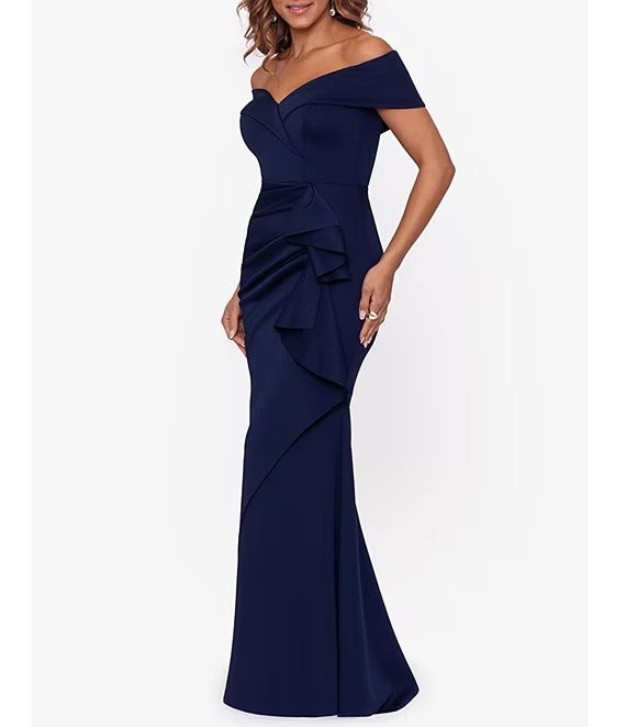 Ruffle edge off shoulder short sleeved fishtail evening dress