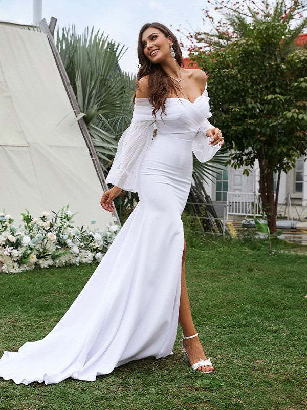 Sheath/Column Stretch Crepe Ruched Off-the-Shoulder Long Sleeves Sweep/Brush Train Wedding Dresses